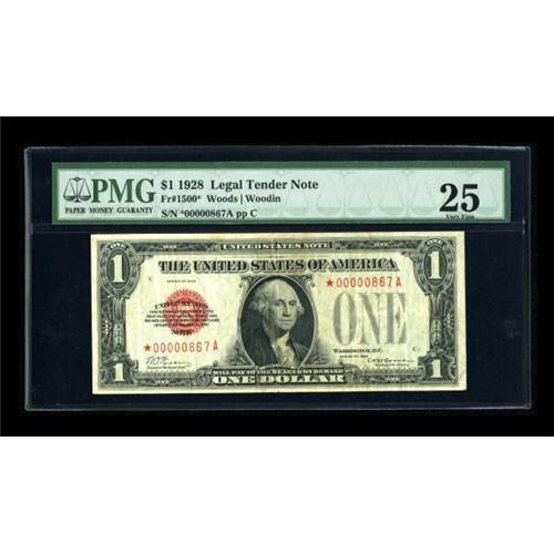 <B>Fr. 1500* $1 1928 Legal Tender Note. PMG Very Fine 25.</B></I><BR> A very attractive example of this just plain rare star. It is an evenly circulated and well centered piece whose bright colors are easily visible through the PMG Very Fine 25 holder it resides in. If you are looking for a certified specimen of this rare early star in a nice circulated grade, this is a note you ought to buy.<BR><BR><b>Shipping:</b> Coins & Currency (<a target="_blank" href="http://www.heritageauctions.com/common/shipping.php">view shipping information</a>)
