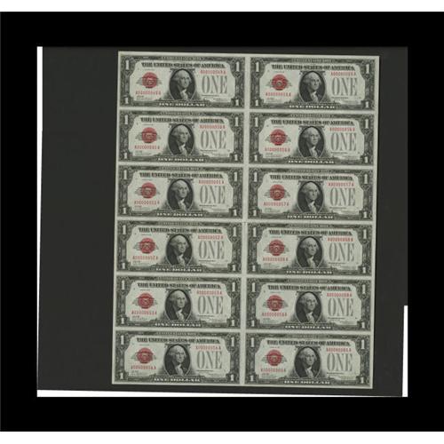 <B>Fr. 1500 $1 1928 Legal Tender Note. Uncut Sheet of 12. Choice Crisp Uncirculated.</B></I><BR>Although the Oakes reference lists eight uncut sheets of this type and denomination, the actual census now stands at just four, with the other four having been cut up over the past few years to supply collectors with desirable low number examples. These individual notes have consistently sold in the $3000-$5000 range, making it economically viable to cut the sheets and sell the singles. With only four sheets now left uncut, the remaining examples are now in high demand, and this beautiful sheet, grading <B>Choice Crisp Uncirculated,</B></I> will likely now realize...<BR><I>From The Plymouth Rock Collection</B></I>