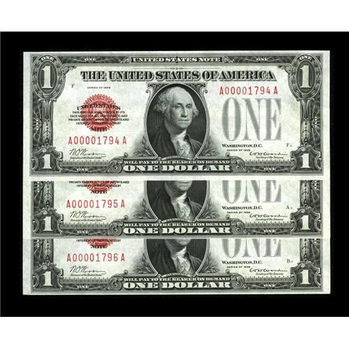 <B>Fr. 1500 $1 1928 Legal Tender Notes. Three Consecutive Examples. Choice Crisp Uncirculated.</B></I><BR>Serial numbers 1794-1796 are found on this trio that also has a counting crinkle. The second two notes have the thin bottom margin, while the first note has a thin top margin.<BR><BR><b>Shipping:</b> Coins & Currency (<a target="_blank" href="http://www.heritageauctions.com/common/shipping.php">view shipping information</a>)