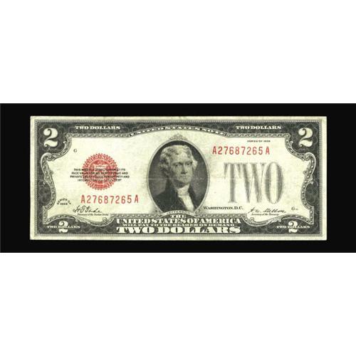 <B>Fr. 1501 $2 1928 Legal Tender. Fine+.</B></I> A very scarce error in the Legal Tender series and especially so in the $2 denomination, an inverted back. The example included tonight is an essentially problem free middle grade example that will enhance any error collection.
