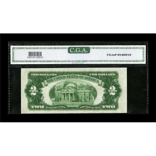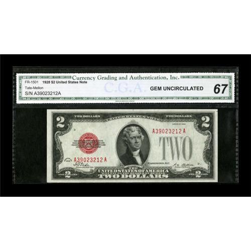 <B>Fr. 1501 $2 1928 Legal Tender Note. CGA Gem Uncirculated 67.</B></I><BR> The paper is blast white on this example from the first issue of small size deuces.<BR><BR><b>Shipping:</b> Coins & Currency (<a target="_blank" href="http://www.heritageauctions.com/common/shipping.php">view shipping information</a>)