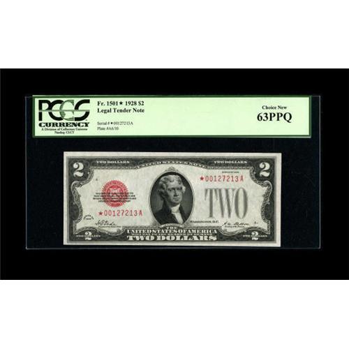 <B>Fr. 1501* $2 1928 Legal Tender Note. PCGS Choice New 63PPQ.</B></I><BR> This scarce Legal Tender star has ideal eye appeal including bright white paper and a deep red overprint. The margins are ample, though a touch small on the bottom.<BR><BR><b>Shipping:</b> Coins & Currency (<a target="_blank" href="http://www.heritageauctions.com/common/shipping.php">view shipping information</a>)