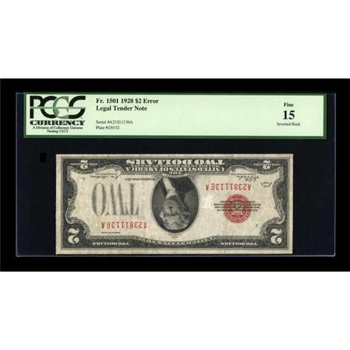 <B>Fr. 1501 $2 1928 Legal Tender Note. PCGS Fine 15.</B></I><BR> This truly scarce invert appeared in our 2005 Taylor Family Collection Auction, where it realized $1,380.<BR><I>From The Amelia Island Collection.</B></I><BR><BR><b>Shipping:</b> Coins & Currency (<a target="_blank" href="http://www.heritageauctions.com/common/shipping.php">view shipping information</a>)