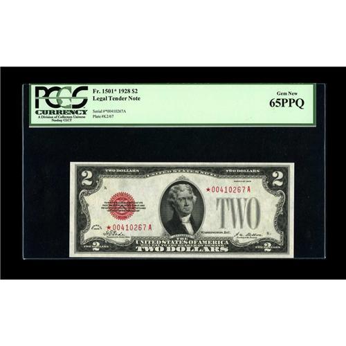 <B>Fr. 1501* $2 1928 Legal Tender Note. PCGS Gem New 65PPQ.</B></I><BR>A sharp example of this early star which displays bright white paper and a vivid red overprint.<BR><BR><b>Shipping:</b> Coin/Currency (<a target="_blank" href="http://www.heritageauctions.com/common/shipping.php">view shipping information</a>)