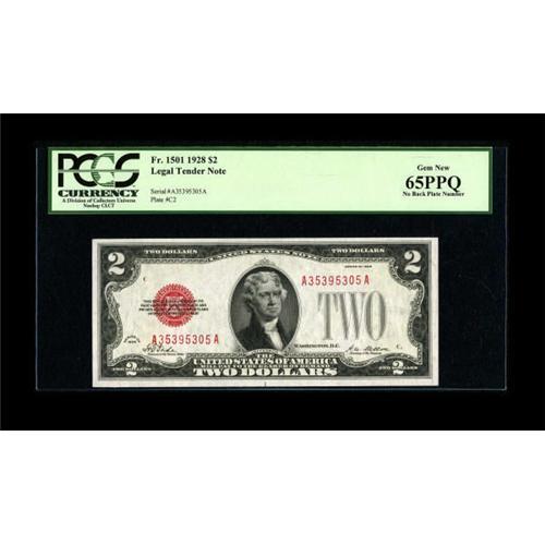<B>Fr. 1501 $2 1928 Legal Tender Note. PCGS Gem New 65PPQ.</B></I><BR> Solid margins and blazing white paper add to the eye appeal of the deeply printed design details. This particular issue lacks a back plate number. Our archive reveals that we have only handled three previous examples, the last in 2005.<BR><BR><b>Shipping:</b> Coins & Currency (<a target="_blank" href="http://www.heritageauctions.com/common/shipping.php">view shipping information</a>)