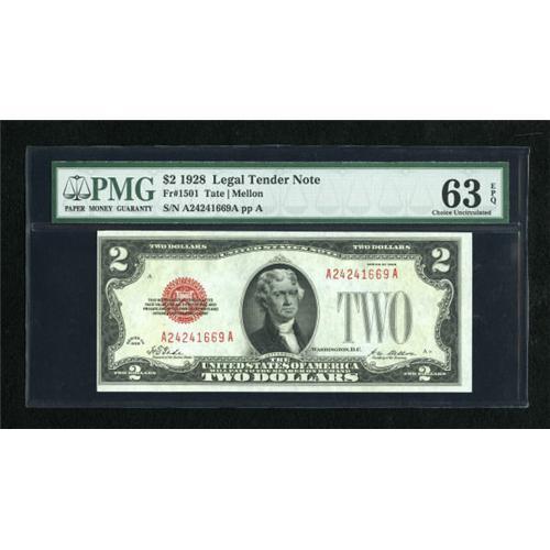 <B>Fr. 1501 $2 1928 Legal Tender Note. PMG Choice Uncirculated 63 EPQ.</B></I><BR> This Deuce has bright paper and a dark fire engine red third printing.<BR><BR><b>Shipping:</b> Coins & Currency (<a target="_blank" href="http://www.heritageauctions.com/common/shipping.php">view shipping information</a>)