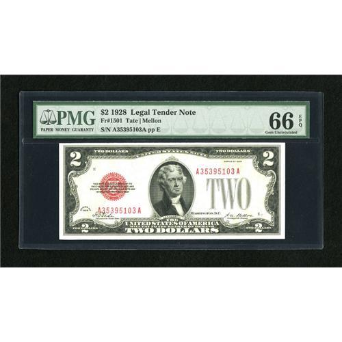 <B>Fr. 1501 $2 1928 Legal Tender Note. PMG Gem Uncirculated 66 EPQ.</B></I><BR>Original paper waves are noted on the Legal Deuce.<BR><BR><b>Shipping:</b> Coins & Currency (<a target="_blank" href="http://www.heritageauctions.com/common/shipping.php">view shipping information</a>)