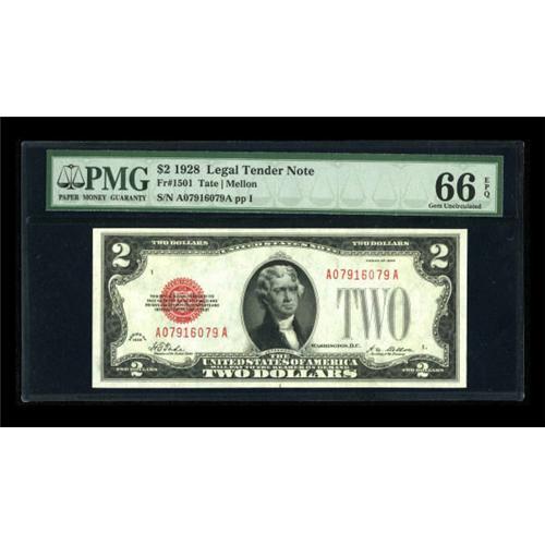 <B>Fr. 1501 $2 1928 Legal Tender Note. PMG Gem Uncirculated 66 EPQ.</B></I><BR> Simply a wonderful example of this first issue small size red seal Deuce.<BR><BR><b>Shipping:</b> Coins & Currency (<a target="_blank" href="http://www.heritageauctions.com/common/shipping.php">view shipping information</a>)