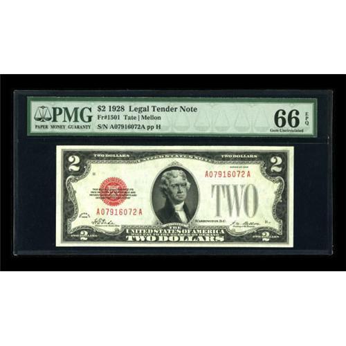 <B>Fr. 1501 $2 1928 Legal Tender Note. PMG Gem Uncirculated 66 EPQ.</B></I><BR> This is another wonderful example from the same pack as the previous note.<BR><BR><b>Shipping:</b> Coins & Currency (<a target="_blank" href="http://www.heritageauctions.com/common/shipping.php">view shipping information</a>)