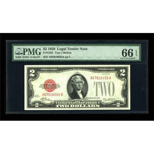 <B>Fr. 1501 $2 1928 Legal Tender Note. PMG Gem Uncirculated 66 EPQ.</B></I><BR> The last in a trio of high grade examples that is well embossed.<BR><BR><b>Shipping:</b> Coins & Currency (<a target="_blank" href="http://www.heritageauctions.com/common/shipping.php">view shipping information</a>)