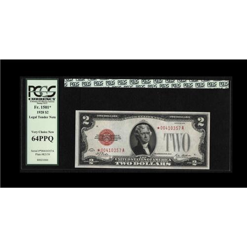 <B>Fr. 1501* $2 1928 Legal Tender Star Note. PCGS Very Choice New 64PPQ.</B></I><BR>This strongly embossed note is well centered and bright with just a pinch of handling visible at right.