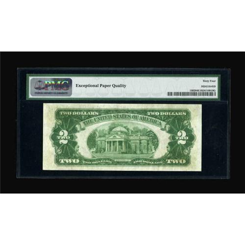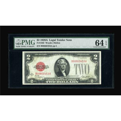 <B>Fr. 1502 $2 1928A Legal Tender Note. PMG Choice Uncirculated 64 EPQ.</B></I><BR> This well margined and bright representative is from the elusive B-A block.<BR><BR><b>Shipping:</b> Coins & Currency (<a target="_blank" href="http://www.heritageauctions.com/common/shipping.php">view shipping information</a>)