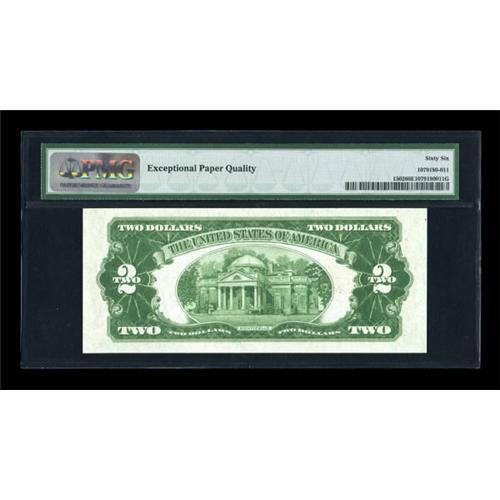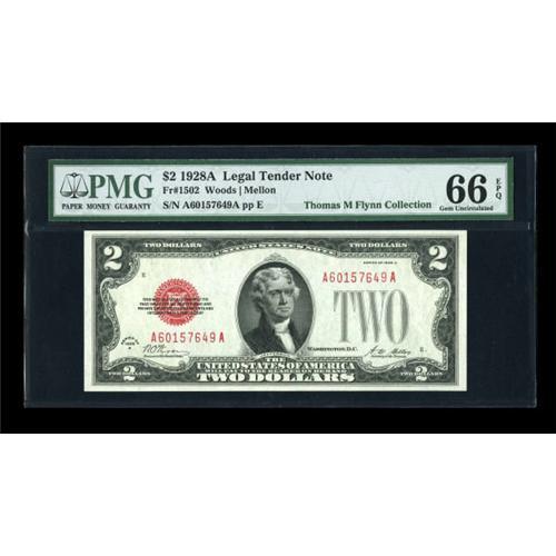 <B>Fr. 1502 $2 1928A Legal Tender Note. PMG Gem Uncirculated 66 EPQ.</B></I><BR> While hardly rare, this is a difficult note to find in top grade, as the centering leaves much to be desired on many examples. This piece is well nigh perfect, featuring total originality and great centering on both face and back. PMG has slabbed over sixty 1928A Legal deuces to date, with only one grading higher than this. <BR><I>From The Thomas M. Flynn Collection</B></I><BR><BR><b>Shipping:</b> Coins & Currency (<a target="_blank" href="http://www.heritageauctions.com/common/shipping.php">view shipping information</a>)