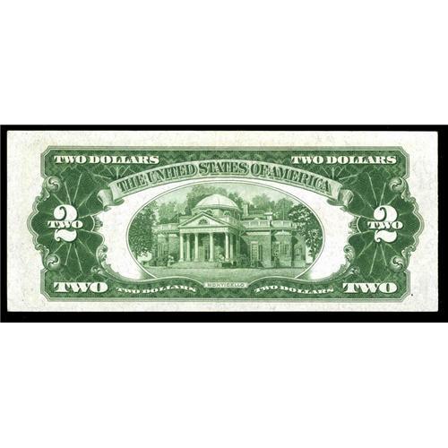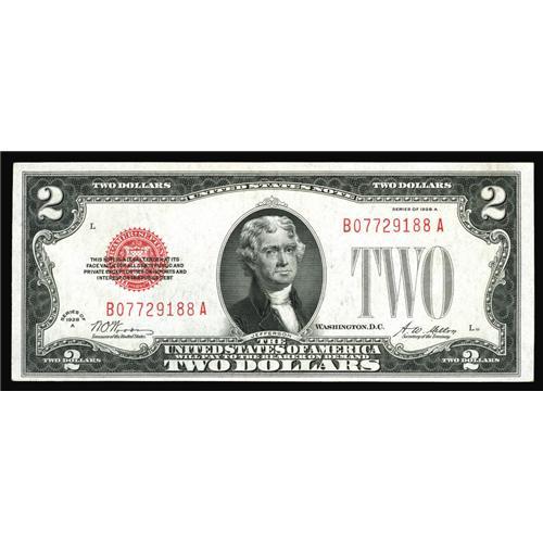 <B>Fr. 1502 $2 1928A Legal Tender Note. Very Choice Crisp Uncirculated.</B></I><BR>The margin at bottom is just a hair too small to consider this beauty a Gem. What's more, this B-A block issue is much scarcer than the A-A block and is listed at $500 in the newest Oakes and Schwartz reference.