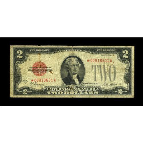 <B>Fr. 1502* $2 1928A Legal Tender Note. Very Good</B></I><BR>Though not as scarce as the 1928B Legal Tender Star, this note holds its own. The note is fine in quality, though a heavy fold at center with light breaks precludes that grade. A very scarce Star in any condition.<BR><BR><b>Shipping:</b> Coin/Currency (<a target="_blank" href="http://www.heritageauctions.com/common/shipping.php">view shipping information</a>)