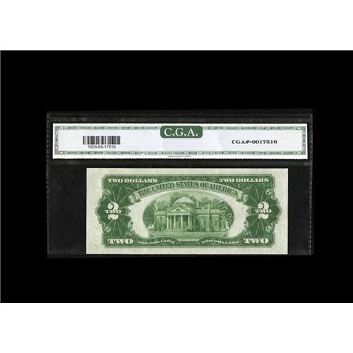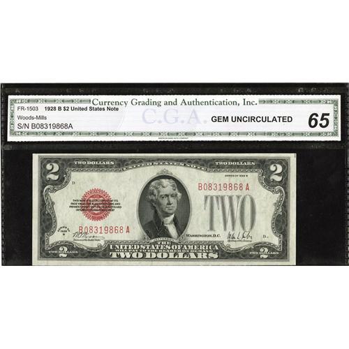 <B>Fr. 1503 $2 1928B Legal Tender Note. CGA Gem Uncirculated 65.</B></I><BR>A beautiful Gem that is well centered and appears to be boldly original. This is the scarcest $2 red seal issue, and high grade survivors are seldom seen.