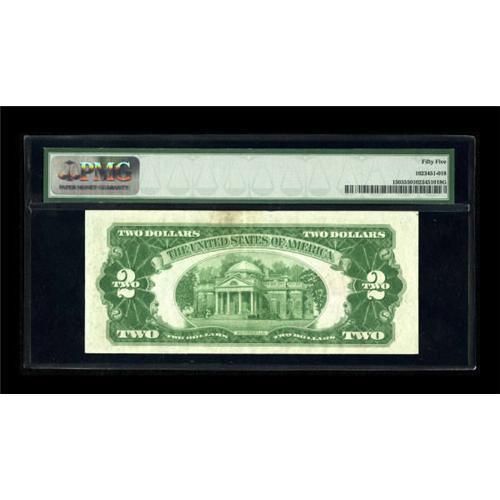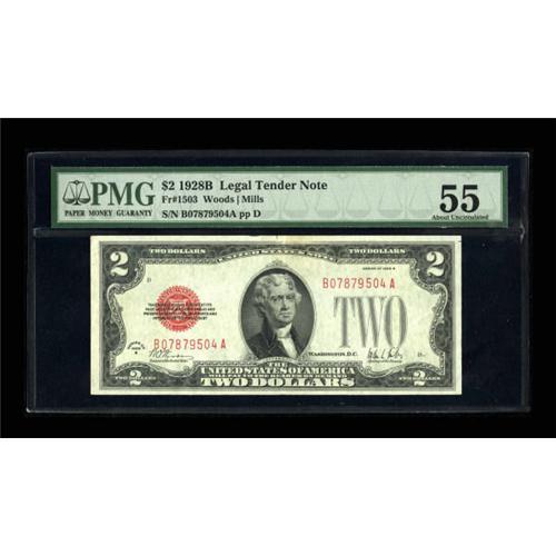 <B>Fr. 1503 $2 1928B Legal Tender Note. PMG About Uncirculated 55.</B></I><BR> A center fold and some counting soil at back top center are noticed on this key to the $2 Legals.<BR><BR><b>Shipping:</b> Coins & Currency (<a target="_blank" href="http://www.heritageauctions.com/common/shipping.php">view shipping information</a>)