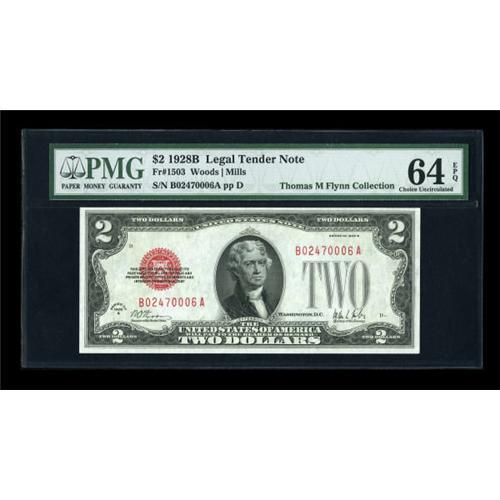<B>Fr. 1503 $2 1928B Legal Tender Note. PMG Choice Uncirculated 64 EPQ.</B></I><BR> Bright and well printed, and oh so close to the full Gem grade. In fact, this PMG certified example is nicer than many of the 1928B deuces we've seen described as Gem over the years. <BR><I>From The Thomas M. Flynn Collection</B></I><BR><BR><b>Shipping:</b> Coins & Currency (<a target="_blank" href="http://www.heritageauctions.com/common/shipping.php">view shipping information</a>)