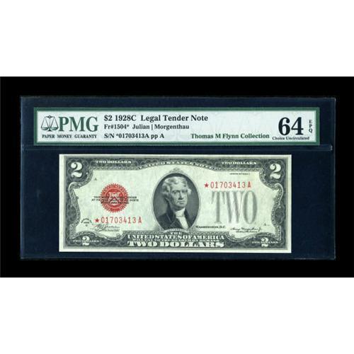 <B>Fr. 1504* $2 1928C Legal Tender Note. PMG Choice Uncirculated 64 EPQ.</B></I><BR> A very scarce star even in circulated grades but one which is prohibitively rare in top grade. PMG has graded ten examples to date, only one (this note) which has come in higher than AU 58. Expect some stiff competition before the hammer falls on this lot, likely in the area of...<BR><I>From The Thomas M. Flynn Collection</B></I><BR><BR><b>Shipping:</b> Coins & Currency (<a target="_blank" href="http://www.heritageauctions.com/common/shipping.php">view shipping information</a>)