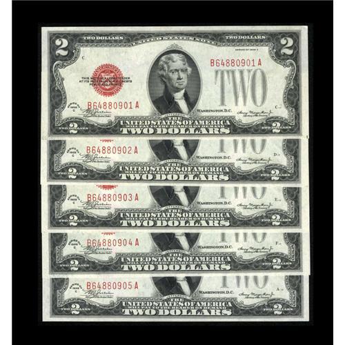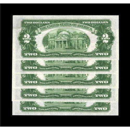 <B>Fr. 1504 $2 1928C Legal Tender Notes. Five Consecutive Examples Very Choice Crisp Uncirculated.</B></I><BR>A nice run of five pack fresh well margined, strongly embossed examples from the B-A block.
