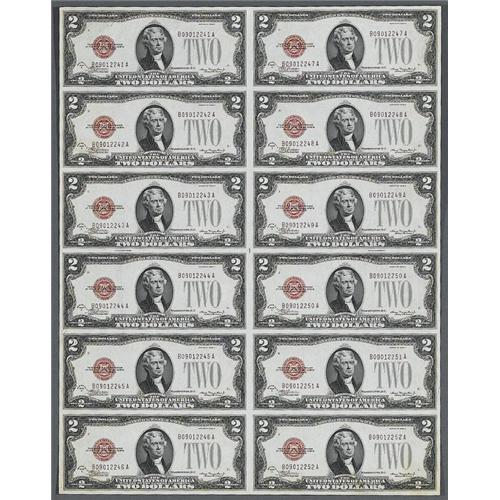 <B>Fr. 1504 $2 1928C Legal Tender Notes. Uncut Sheet of 12. Choice Crisp Uncirculated.</B></I><BR>Early uncut sheets always hold fascination with collectors and non-collectors alike. Corner tip handling and a paper clip indentation are observed.<BR><BR><b>Shipping:</b> Coin/Currency (<a target="_blank" href="http://www.heritageauctions.com/common/shipping.php">view shipping information</a>)