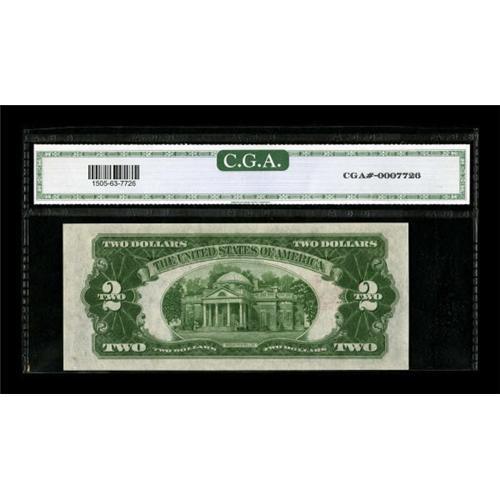<B>Fr. 1505* $2 1928D Legal Tender Note. CGA Choice Uncirculated 63.</B></I><BR> A bright, pleasing example of a popular replacement note.<BR><BR><b>Shipping:</b> Coins & Currency (<a target="_blank" href="http://www.heritageauctions.com/common/shipping.php">view shipping information</a>)