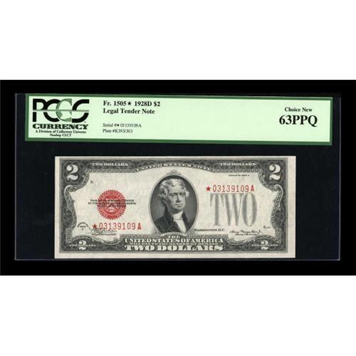 <B>Fr. 1505* $2 1928D Legal Tender Note. PCGS Choice New 63PPQ.</B></I><BR> A thin top margin is the reason for the grade though the colors remain bright on this pleasing replacement.<BR><I>From The Drew Keough Collection</B></I><BR><BR><b>Shipping:</b> Coins & Currency (<a target="_blank" href="http://www.heritageauctions.com/common/shipping.php">view shipping information</a>)