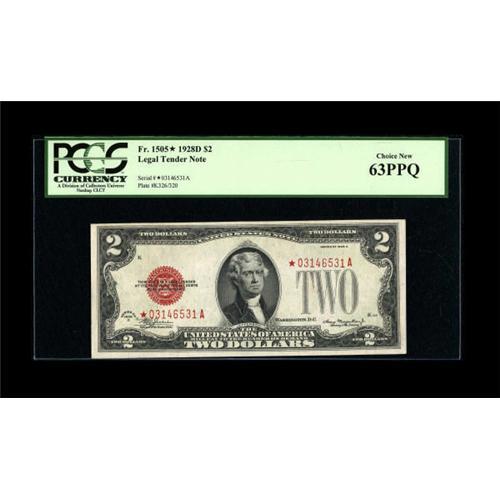 <B>Fr. 1505* $2 1928D Legal Tender Note. PCGS Choice New 63PPQ.</B></I><BR> Pleasing, original paper waves are noted in the holder on this non-mule Star.<BR><BR><b>Shipping:</b> Coins & Currency (<a target="_blank" href="http://www.heritageauctions.com/common/shipping.php">view shipping information</a>)