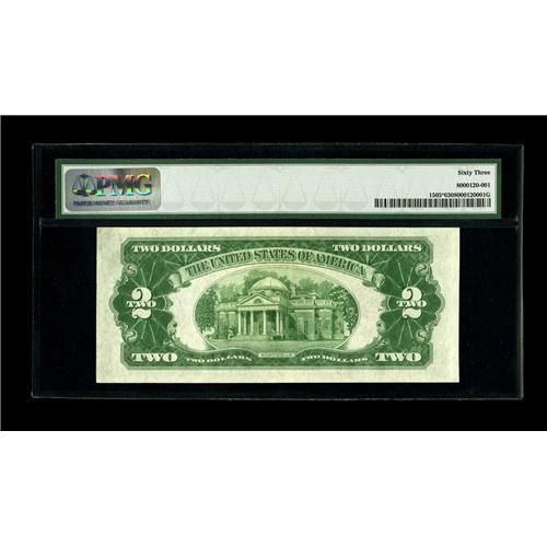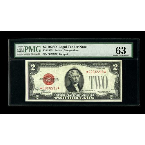 <B>Fr. 1505* $2 1928D Legal Tender Note. PMG Choice Uncirculated 63.</B></I><BR>Hulking margins and bold embossing are both clearly seen on this elusive star that appears to have a small corner tip fold outside the frame line.<BR><BR><b>Shipping:</b> Coin/Currency (<a target="_blank" href="http://www.heritageauctions.com/common/shipping.php">view shipping information</a>)