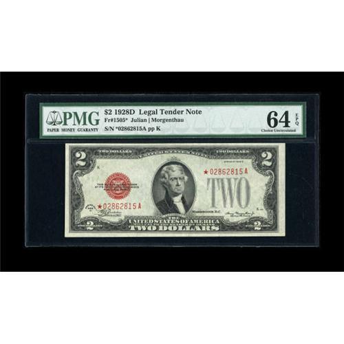<B>Fr. 1505* $2 1928D Legal Tender Note. PMG Choice Uncirculated 64 EPQ.</B></I><BR> A little thin along the top though well embossed and brightly inked.<BR><BR><b>Shipping:</b> Coins & Currency (<a target="_blank" href="http://www.heritageauctions.com/common/shipping.php">view shipping information</a>)