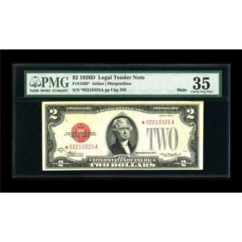 <B>Fr. 1505* $2 1928D Mule Legal Tender Note. PMG Choice Very Fine 35.</B></I><BR> Back plate number 282 is noted on this Mule. The bright paper and cherry red overprint gives this piece the overall appearance of an EF note.<BR><BR><b>Shipping:</b> Coins & Currency (<a target="_blank" href="http://www.heritageauctions.com/common/shipping.php">view shipping information</a>)