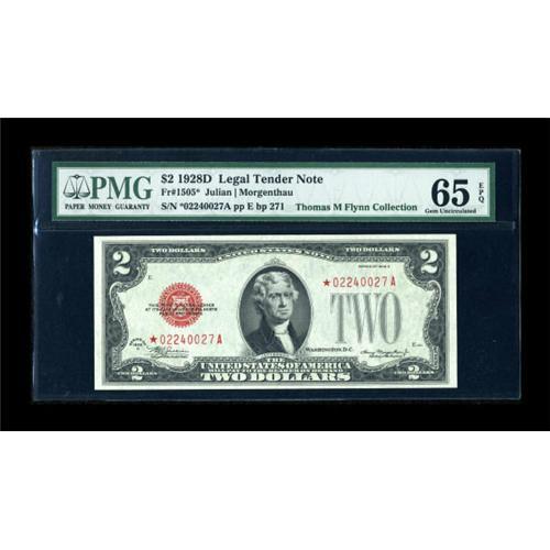 <B>Fr. 1505* $2 1928D Mule Legal Tender Note. PMG Gem Uncirculated 65 EPQ.</B></I><BR> A fresh and vividly colored example of this scarce mule star, which bears back plate number 271. PMG has not noted this note as a mule on their holder, but will certainly reholder it upon request. <BR><I>From The Thomas M. Flynn Collection</B></I><BR><BR><b>Shipping:</b> Coins & Currency (<a target="_blank" href="http://www.heritageauctions.com/common/shipping.php">view shipping information</a>)