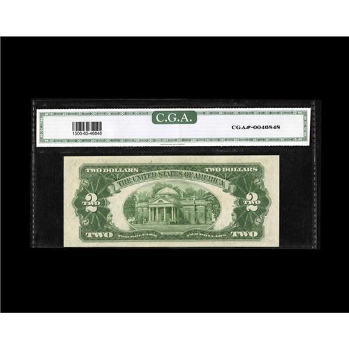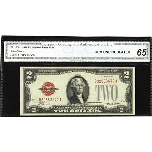 <B>Fr. 1506 $2 1928E Legal Tender Note. CGA Gem Uncirculated 65.</B></I><BR>A nicely margined, colorful example of this issue elusive in higher grade.