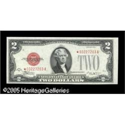 <B>Fr. 1506* $2 1928E Legal Tender Note. Choice Crisp Uncirculated.</B></I><BR>This is one of four or five uncirculated 1928E stars which were unearthed in the mid-1990's by Boston dealer Tom Denly. The paper quality here is as nice as any we've seen, and the colors and originality are first rate. If the centering were up to its other attributes, we would not hesitate to label this a gem, but both the face and back are shifted enough to make that designation impossible. It's still a note which will easily reach and likely exceed... Lot:15600