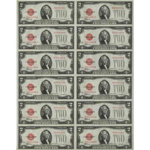<B>Fr. 1506 $2 1928E Legal Tender Notes. Uncut Sheet of 12. Choice Crisp Uncirculated.</B></I><BR>Embossing is strong on this uncut sheet. The upper left-hand corner tip has discolored slightly. We have had only three sheets of this series in the last six years.<BR><I>From The Wilhelmina Collection</B></I><BR><BR><b>Shipping:</b> Coin/Currency (<a target="_blank" href="http://www.heritageauctions.com/common/shipping.php">view shipping information</a>)