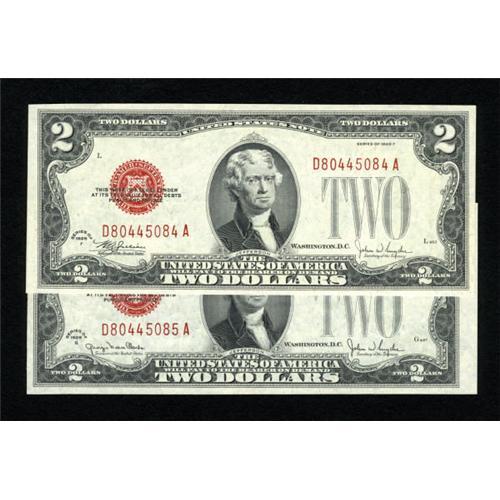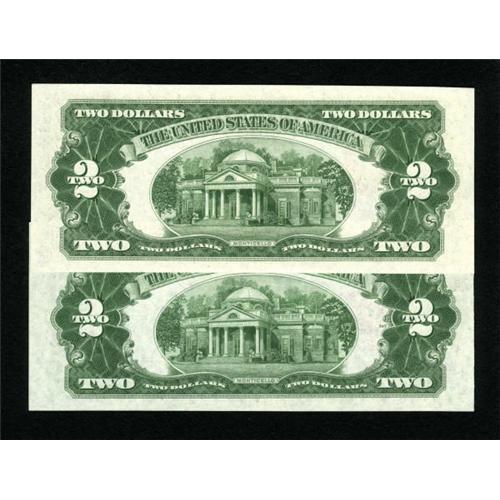<B>Fr. 1507/1508 $2 1928F/1928G Legal Tender Notes. Changeover Pair. Gem Crisp Uncirculated.</B></I><BR> We originally sold this pair in January 1998. There was only one changeover pair listed in the Oakes-Schwartz reference then and there is still just one changeover pair listed in the new Schwartz-Lindquist reference. This pair has not been added to the census. Embossing is seen on both of these notes.<BR><BR><I>From The Drew Keough Collection</B></I><BR><BR><b>Shipping:</b> Coins & Currency (<a target="_blank" href="http://www.heritageauctions.com/common/shipping.php">view shipping information</a>)