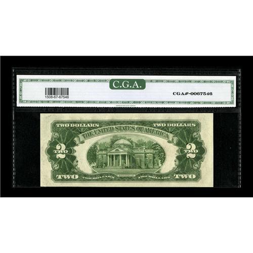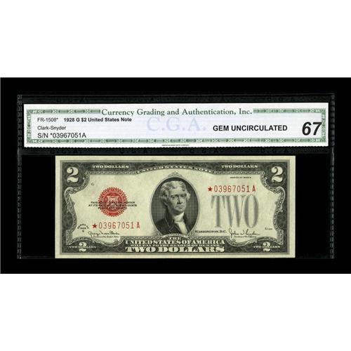<B>Fr. 1508* $2 1928G Legal Tender Note. CGA Gem Uncirculated 67.</B></I><BR>This is a fresh, bright and seemingly near perfect example of this more available Red Seal star that has been blessed with fire engine red inks and huge margins.<BR><BR><b>Shipping:</b> Coin/Currency (<a target="_blank" href="http://www.heritageauctions.com/common/shipping.php">view shipping information</a>)