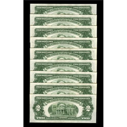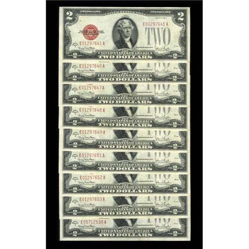 <B>Fr. 1508 $2 1928G Legal Tender Notes. Nine Examples. Choice Crisp Uncirculated.</B></I><BR>Embossing and original paper surfaces are noticed on this grouping that has seven notes consecutively numbered.
