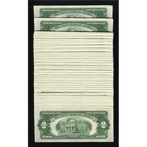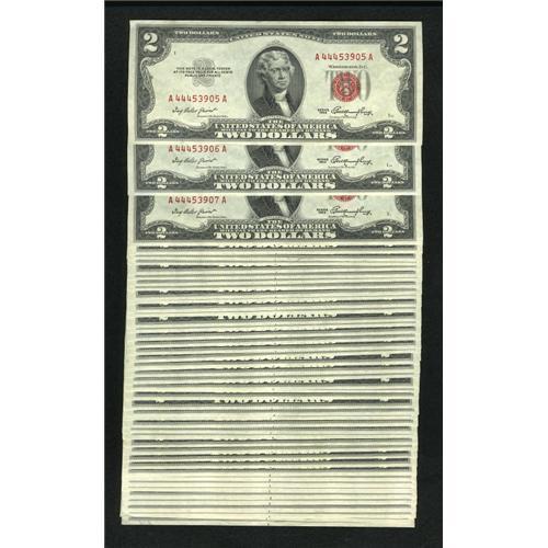 <B>Fr. 1509 $2 1953 Legal Tender Notes. 47 Examples. Choice Crisp Uncirculated.</B></I><BR> A few consecutive runs are seen within this snappy batch of Red Seals. The last note grades AU.<BR><BR><b>Shipping:</b> Coins & Currency (<a target="_blank" href="http://www.heritageauctions.com/common/shipping.php">view shipping information</a>)