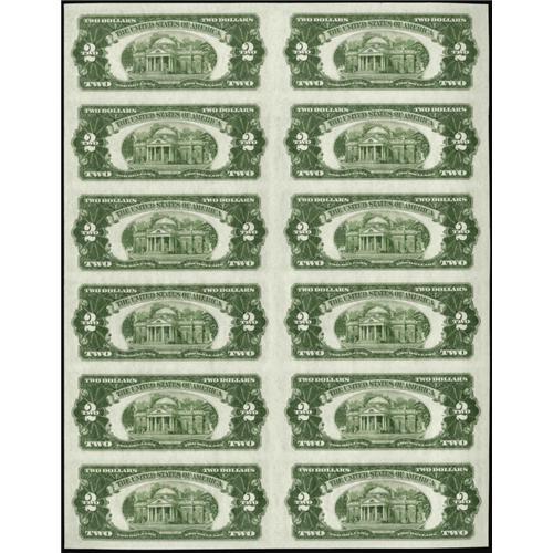 <B>Fr. 1509 $2 1953 Legal Tender Notes. Uncut Sheet of 12. Very Choice Crisp Uncirculated.</B></I><BR>This was originally printed as an 18-subject sheet as the 1953 Series ushered in the sheet of 18 configuration for $2 Legals. The first row of six notes have been removed from this sheet, leaving the final 12 notes behind. Still a beautiful partial sheet with its fire engine red overprint and wide margins. The lightest of handling is found within the margin of one of the bottom notes.