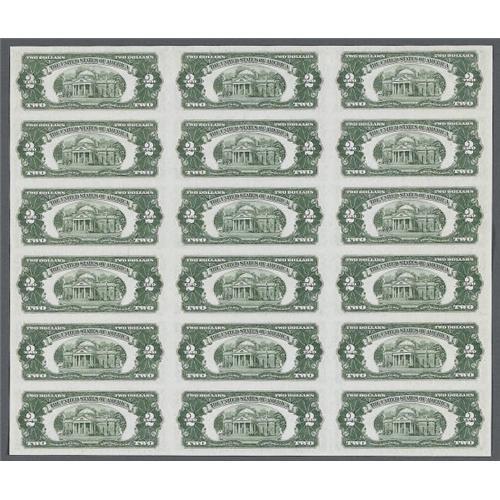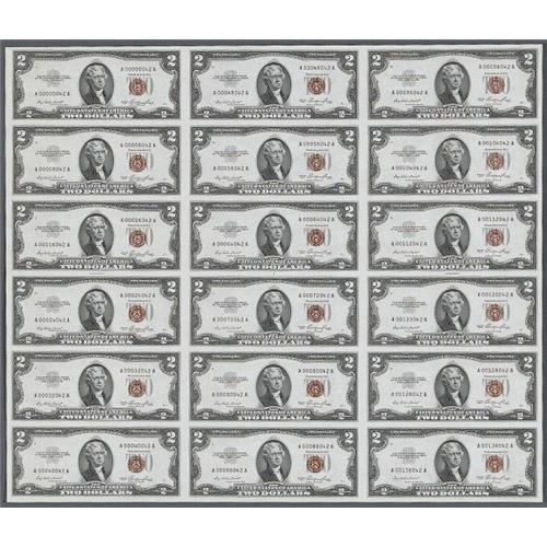 <B>Fr. 1509 $2 1953 Legal Tender Notes. Uncut Sheet of 18. Gem Crisp Uncirculated.</B></I><BR>Serial number 42 is found on the first note of this sheet. This is the story often told for the stoppage of uncut sheet sales, "One night the new Secretary of the Treasury George M. Humphrey was having dinner at a Washington, DC restaurant. At a nearby table a man proceeded to pull out an uncut sheet and started to cut notes off of it to pay his bill. Mr. Humphrey was so infuriated by this action that he had sales of uncut sheets stopped."<BR><I>From The Wilhelmina Collection</B></I><BR><BR><b>Shipping:</b> Coin/Currency (<a target="_blank" href="http://www.heritageauctions.com/common/shipping.php">view shipping information</a>)