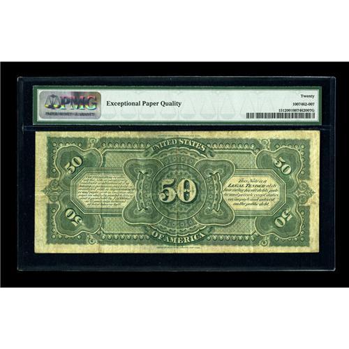 <B>Fr. 151 $50 1869 Legal Tender PMG Very Fine 20 EPQ.</B></I> Over 15 percent of the population for this Friedberg number is tied up by various governmental agencies. This serial number which is new to the census is a welcome addition in a grade that is in the minority. Though some pinholes are noticed, this high denomination Rainbow has been awarded the EPQ designation. These notes are sorely lacking on the market and produce strong bids whenever offered. We would not be surprised to see this one-number type realize. . .<BR><BR><b>Shipping:</b> Coin/Currency (<a target="_blank" href="http://www.heritageauctions.com/common/shipping.php">view shipping information</a>)