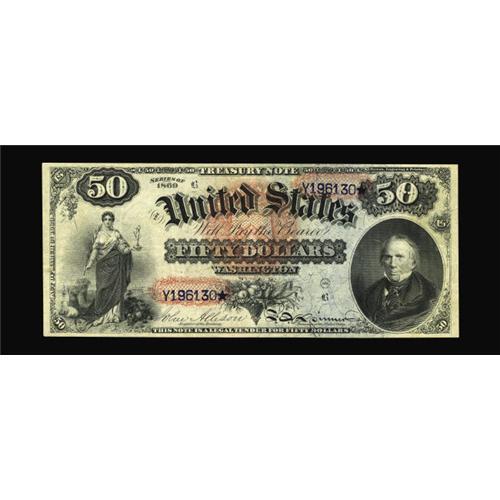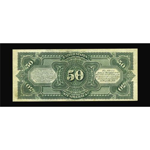 <B>Fr. 151 $50 1869 Legal Tender Very Fine-Extremely Fine.</B></I> This is an evenly circulated Rainbow $50 that has light folds. It also exhibits sound edges and full margins and is problem-free. This note has a provenance back to Louis Werner, New York coin dealer and sergeant-at-arms of the ANA for 25 years. Sixty-three pieces are known for this type, and at least fourteen of those are in government or museum hands. Only a couple of handfuls of notes, including several permanently off the market, are reported to be in a higher-grade than this example. There is not a hint of a repair or restoration of any kind. Even when candled (viewed with the light source passing through it), none of the folds are heavy enough to be seen as dark lines. In May 2005 we sold a similar graded note for $63,250. It's a pleasure to handle this rarity, and we would expect this one-number type to easily realize...<BR><I>From The Plymouth Rock Collection</B></I>