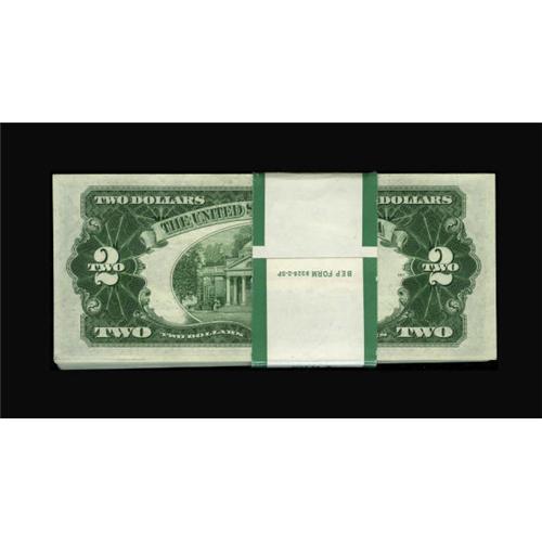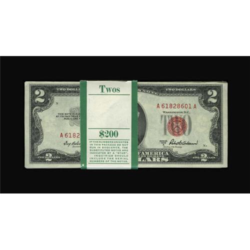 <B>Fr. 1510 $2 1953A Legal Tender Notes. 100 Notes. Choice Crisp Uncirculated.</B></I><BR> This nicely preserved pack of 100 has an original BEP band, but the 13th, 25th, and 44th note have been replaced with notes from a different pack. <BR><I>From The Drew Keough Collection</B></I><BR><BR><b>Shipping:</b> Coins & Currency (<a target="_blank" href="http://www.heritageauctions.com/common/shipping.php">view shipping information</a>)