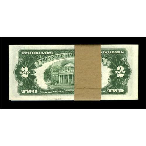 <B>Fr. 1510 $2 1953A Legal Tender Notes. Pack of 100. Choice Crisp Uncirculated.</B></I><BR> This pack kicks-off with a Star with signs of edge handling, then there are 98 consecutive notes, and then a final non-consecutive note to end the pack. A generic money band has been turned inside-out to hold these notes. A recent advertisement for packs by a leading paper money dealer in a premier numismatic paper lists only one $2 United States Note pack available.<BR><I>From The Drew Keough Collection</B></I><BR><BR><b>Shipping:</b> Coins & Currency (<a target="_blank" href="http://www.heritageauctions.com/common/shipping.php">view shipping information</a>)