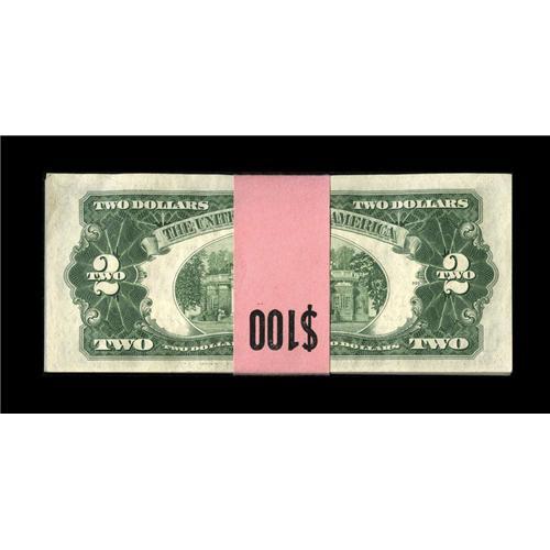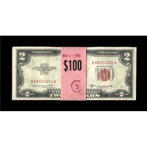 <B>Fr. 1511 $2 1953B Legal Tender Notes. Fifty Consecutive Examples. Choice Crisp Uncirculated.</B></I><BR>Teller 2 stamped the bank band for this run on Mar 27, 1963. The notes are nicely centered and embossed. A few of the outside notes show handling with the remaining notes gem quality or certainly close to it.<BR><BR><b>Shipping:</b> Coins & Currency (<a target="_blank" href="http://www.heritageauctions.com/common/shipping.php">view shipping information</a>)