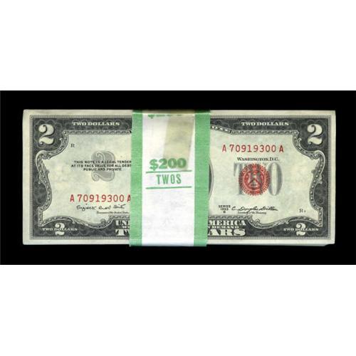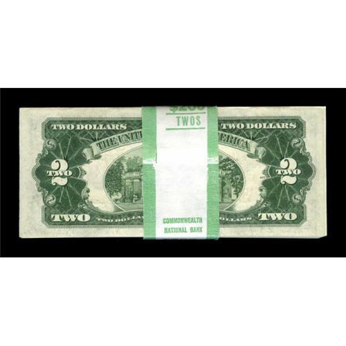 <B>Fr. 1511 $2 1953B Legal Tender Notes. Pack of 100. Choice Crisp Uncirculated.</B></I><BR> This pack works its way from the highest serial number to the lowest and is held by a Commonwealth National Bank band. In the latest Schwartz reference 1953B $2s are listed at $20 per note.<BR><I>From The Drew Keough Collection</B></I><BR><BR><b>Shipping:</b> Coins & Currency (<a target="_blank" href="http://www.heritageauctions.com/common/shipping.php">view shipping information</a>)