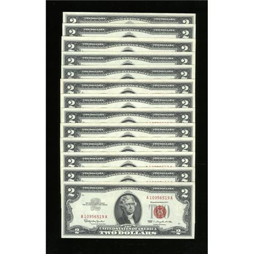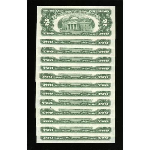 <B>Fr. 1513 $2 1963 Legal Tender Notes. 13 Examples Choice Crisp Uncirculated.</B></I><BR> A pleasing grouping with decent margins and some embossing present.<BR><I>From The Drew Keough Collection</B></I><BR><BR><b>Shipping:</b> Coins & Currency (<a target="_blank" href="http://www.heritageauctions.com/common/shipping.php">view shipping information</a>)