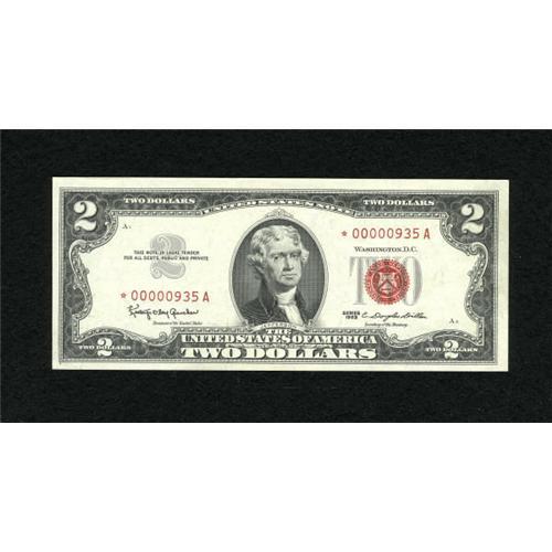 <B>Fr. 1513* $2 1963 Legal Tender Note. Crisp Uncirculated.</B></I><BR> A low three digit serial number is noticed on this replacement with a corner ding.<BR><BR><b>Shipping:</b> Coins & Currency (<a target="_blank" href="http://www.heritageauctions.com/common/shipping.php">view shipping information</a>)