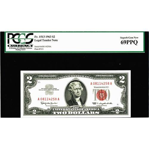 <B>Fr. 1513 $2 1963 Legal Tender Note. PCGS Superb Gem New 69PPQ.</B></I><BR>This lofty grade has seldom been given to this issue. Gargantuan margins are displayed.